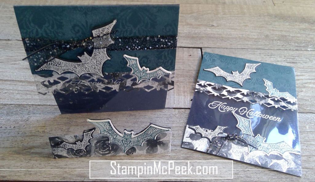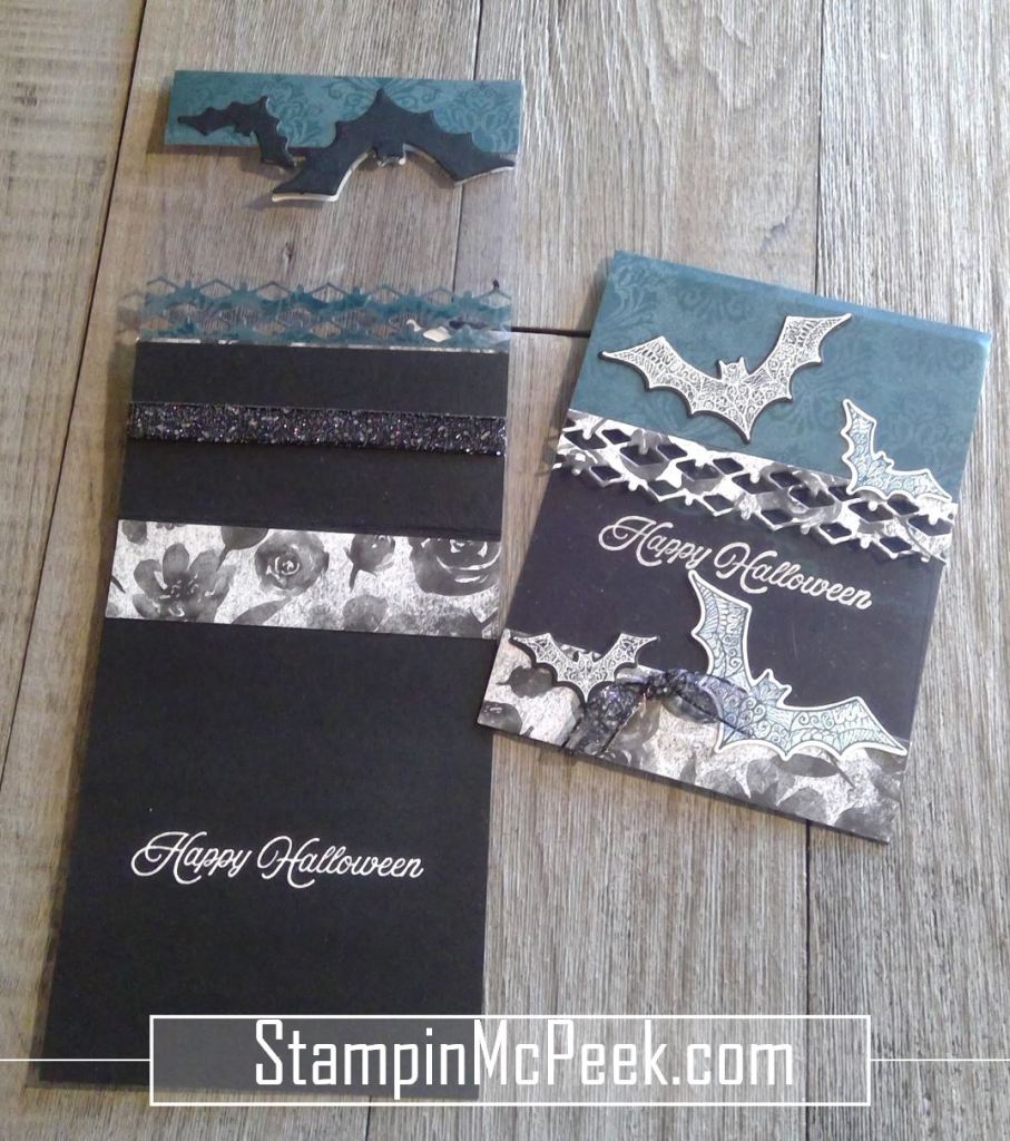 The black bat has white embossed image and the white image is pretty peacock. I used a transparency for the see through window. I also love the black and white rose print on the bottom piece.