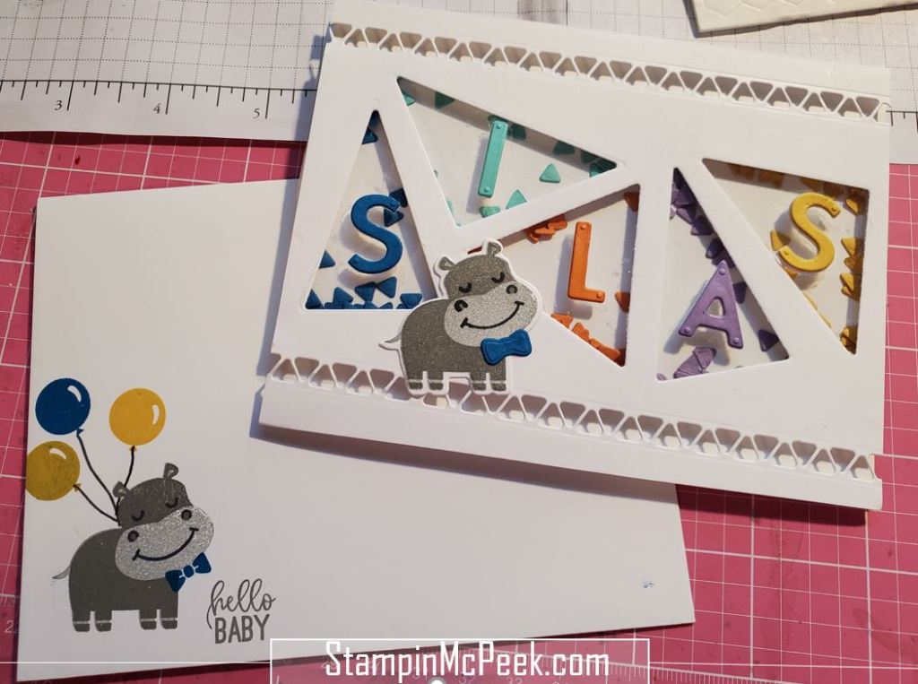 A family friend just had a baby boy and they named him Silas. I thought a custom name deserved a custom card! I used the Happy Hippo and stitched triangle thinlets. I hope you like the card I am very happy with it 🙂